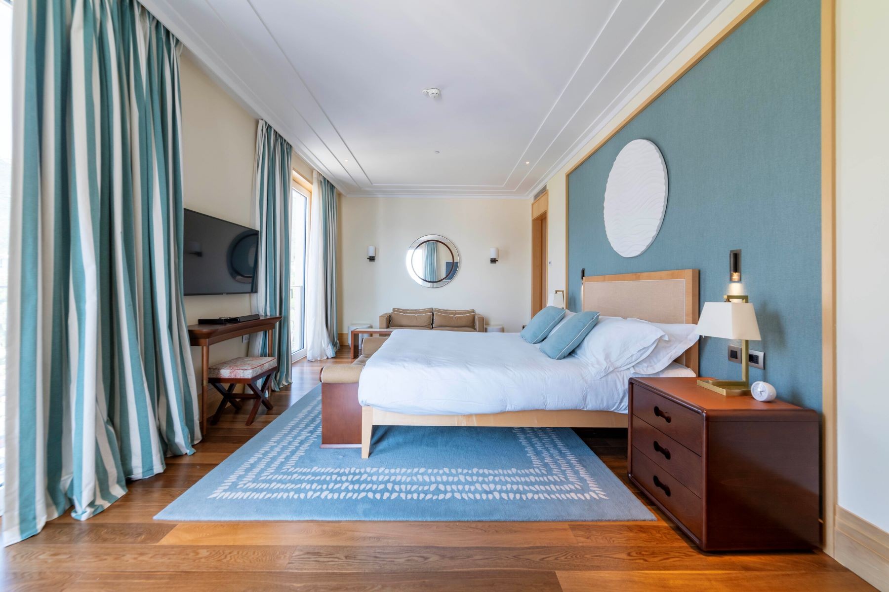 The main level features a spacious open-plan living area with a modern kitchen and dining zone, three en-suite bedrooms, and three separate terraces (62 m² in total), each offering a unique view and outdoor lounge area. The master bedroom opens directly onto the largest waterfront terrace.